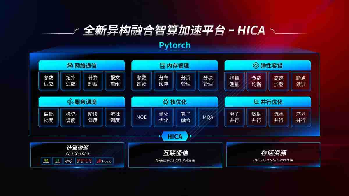 通过自研的服务层、、、中间适配层、、、、以及调度编排算法,,采用数据并行、、模型并行等多种并行方式,,把并行计算任务进行有效的分解,,,使其分别由相应的软件栈和算力资源来承接。。。。当GPU资源变化,,,HICA可以实时动态调度计算子任务并调整模型拓扑和架构,,,,以充分聚合各种算力资源。。。。