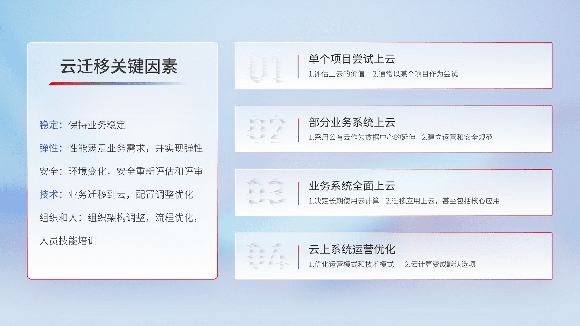 结合实际业务,,从规划设计、、云平台选型、、、云原生改造、、、数据迁移、、、集成交付,,迁移全过程为客户识别最佳上云路径,,,做好风险识别管理,,,设计网络架构、、、、身份权限、、安全审计合规、、、、操作审计、、日志审计、、、监控告警策略、、、、多站点容灾设计等,,,对云上基础设施进行整体规划,,,,提升IT治理水平,,以满足弹性、、高可用、、高性能的需求。。