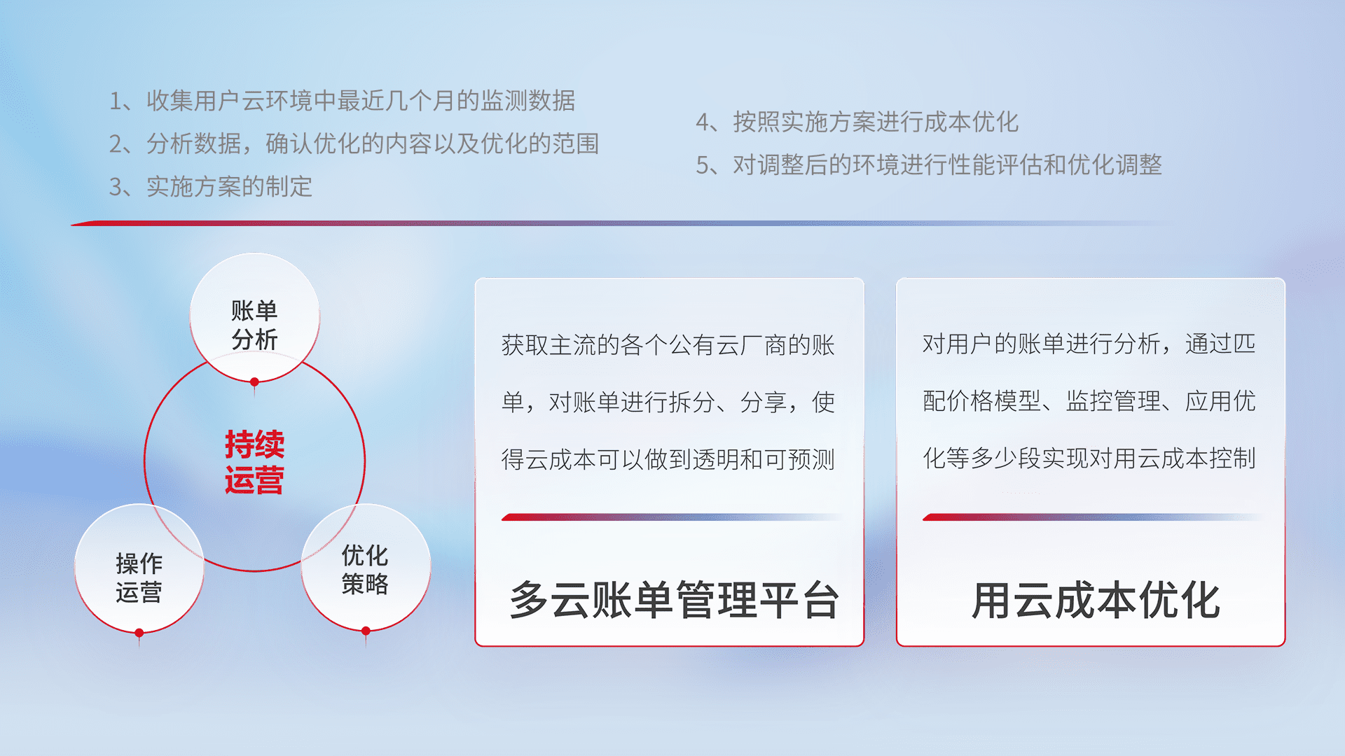 通过多云纳管,,,,以统一的资源数据模型把客户的云资源进行抽象和封装,,,进而实现对多云资源的统一操作,,,,保障云资源管理的可靠性、、、稳定性与可用性。。。量身定制化运维内容,,配置、、、开发运维、、、、补丁管理、、、、备份、、、监控、、认证和访问管理、、审计和日常巡检等,,,,保障在用云过程中的可靠度,,,,稳定度以及高可用率。。